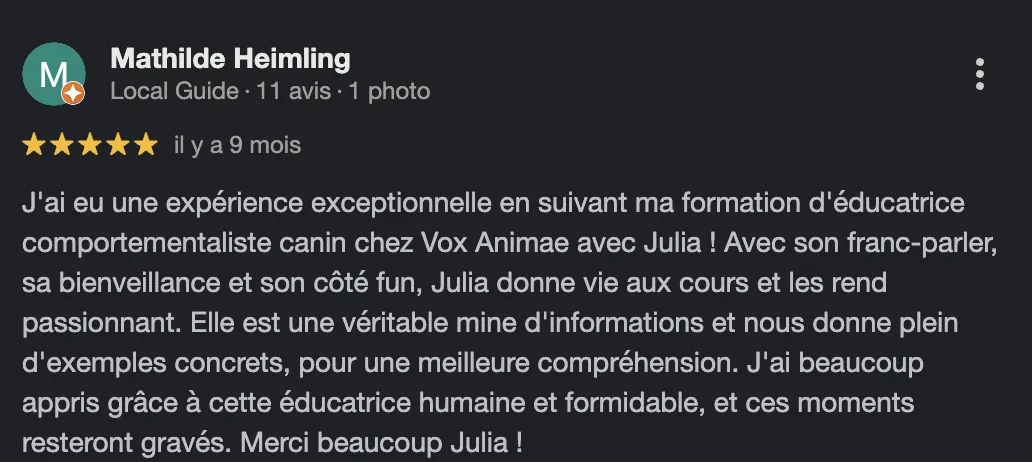Mais après le stage avec Julia, je sais maintenant axer mon regard sur les apprentissages à affiner et proposer les exercices appropriés à chaque chien. La différence est incroyable !